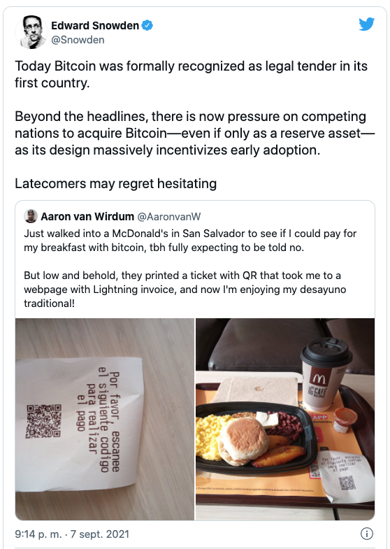 Snowden often communicates through the Twitter platform, several times he has also talked about cryptocurrencies, this time Snowden commented on a tweet by crypto journalist Aaron van Wirdum, who was able to pay for his McDonald's meal in San Salvador on September 7 in Bitcoin. Snowden responded to Aaron Van Wirdum's tweet by pointing out how there could now be pressure on competing nations to acquire bitcoin and how this could incentivize adoption: